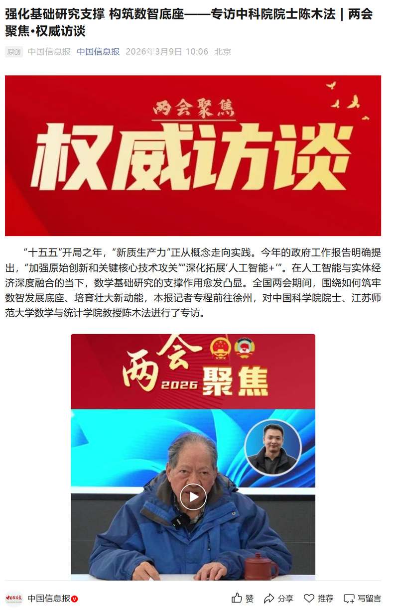 中国信息报两会特刊3月9日报道对陈木法院士的访谈,报道内容如下: